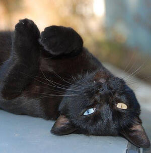 Jadeclaw is a dark-smoky black cat with green claws, stained from digging up plants, and two toned eyes - one fully blue, one mostly yellow with a bit of blue.